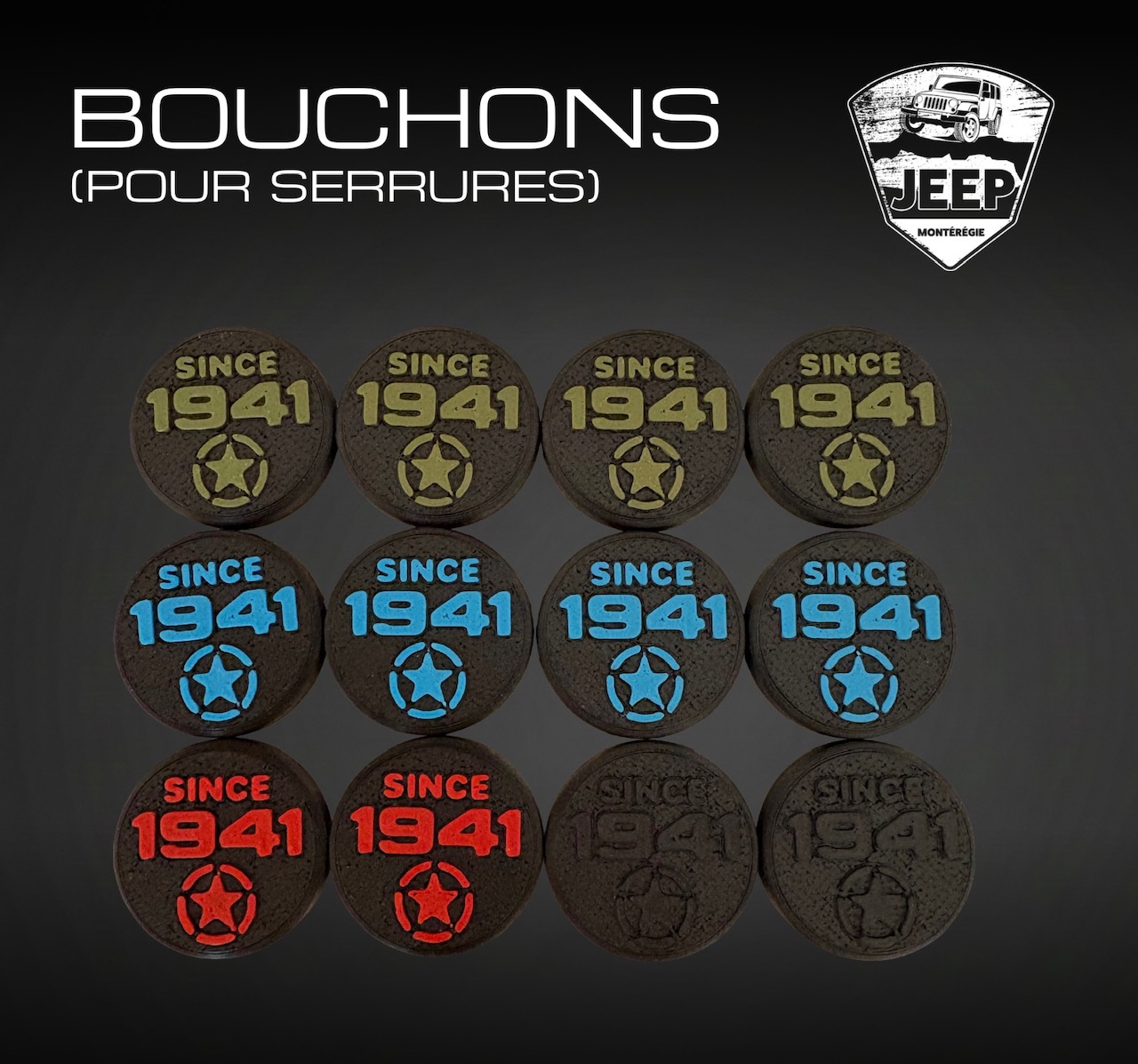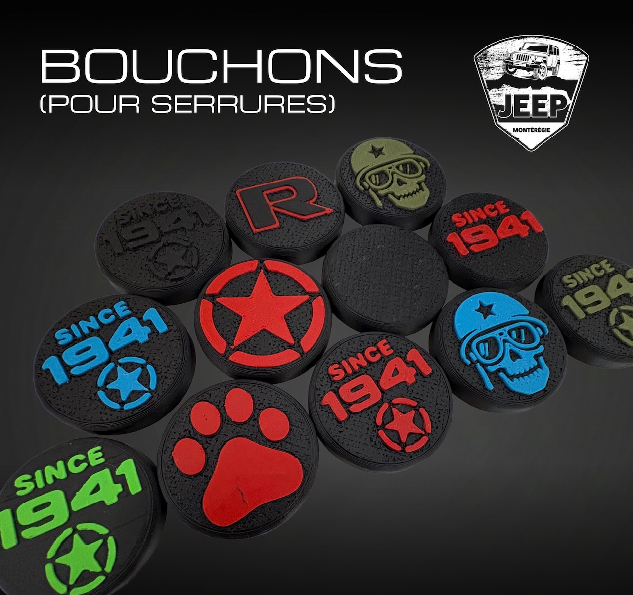 Bouchons esthétiques pour serrures de portes de jeeps. Fait en plastique ASA, ayant une plus grande résistance à la chaleur et aux UV. Plusieurs logos et couleurs disponibles.